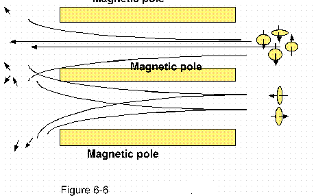 By illustration figure 6-6, electrons H and B may pass straight on through as if they were neutral, or if moved closer to one pole of the other they may be deflected accordingly.