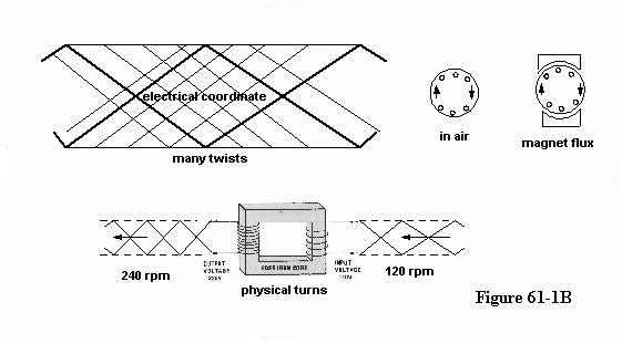 And so it is that - and this is very important to realize how; "turns of motion compliments turns of motion." The electrical current is in effect a rotational entity, and while it may be raised or lowered by increasing or decrease in the speed at which the armature turns, it can equally well be done by adding or taking away "physical turns."