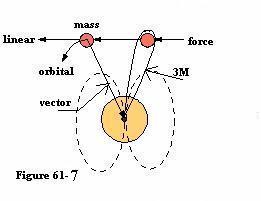 And having detailed that part a number of times already in various ways, it is here to refresh our memory by figure 61-7, where at X the relation may be envisioned, while at Y, the mass is drawn into a change of direction that instantly results into a torque upon her inertia, keeping that mass into an orbital pattern to the vector of force.