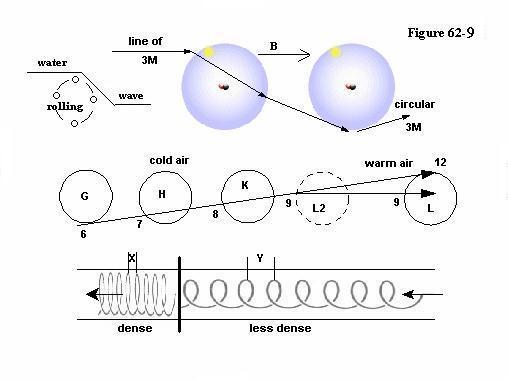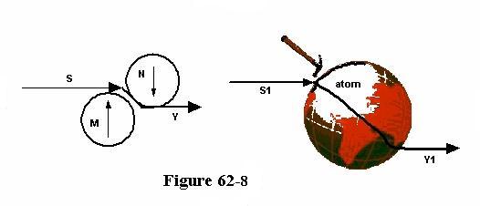 By figure 62-8 assume atom M, to be either stationary or driven upwards, while atom N, by an impulse is driven downwards. Line S therefore takes on the angular as shown into direction Y.