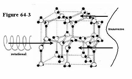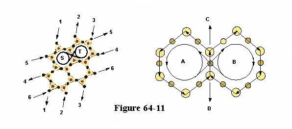 There are a few other pointers we could look at by figure 64-11, how beside movement of like directions bonding to one another, they are strengthened in one another, like these molecules of ice on the right, or that of glass on the left, their movement in the hexagons complimenting one another.