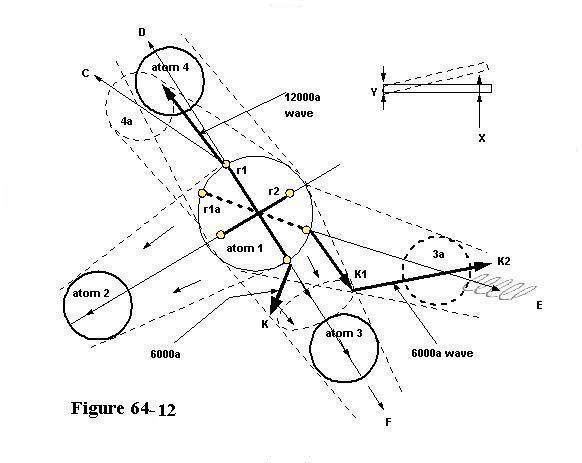 By figure 64-12, atom 1, shall be an atom such as found in metals, with atoms 2, 3, and 4 such other atoms that normally bind themselves thereto. In other words even though my drawing has the appearance of a water molecule, in reality it is a part of the compound element, like metallic, the wire used in most light-bulbs.