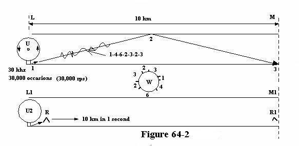 For when at U2, - the wheel at 30 kHz - drove a dent (r) into the line, while the 3M at its velocity of 300,000 km/sec, took it away, we, in looking again for that dent - were forced to go 10 kilometers down the line at R1 to find it.
