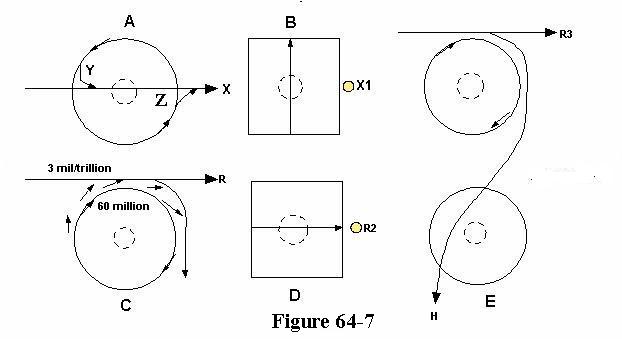If on the other hand we observe atom A, in figure 64-7, and the light X, passes over it, assuming the ring as the circle of the electron, we might presume that on the left at Y, the electron movement joins with X, and on its right at Z it also joins with X. This scenario however is not possible, since no wavelength of light ever passes any electron ring in that fashion.