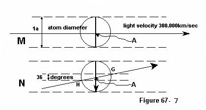 By figure 67-7 at M the light passes from left to right over the atom, with a velocity at nearly 300.000 km/sec. As then it makes contact upon the the electron ring noted at A, how may it effect the movement of that electron ring?