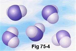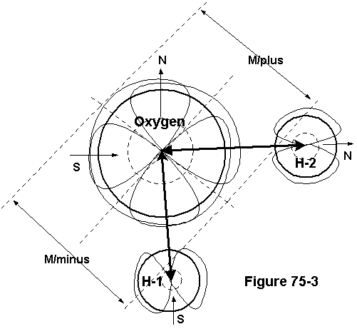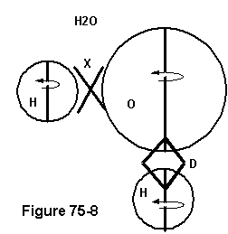 By Figure 75-8, is a molecule of water, the lines through them are their axis of rotation, and all three of them are turning in like direction. And so the lower atom of H has it northern pole locked on with the southern pole of the Oxygen atom. (D)
