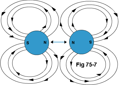 Then there is this fact with magnets, when they are faced with like directions of movement, north to south as by Figure 75-2, H as north and G as south, they will clamp onto one another body to body.