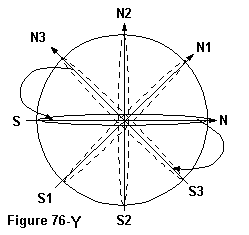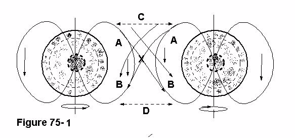 If now we consider Figure 75-1, of our previous chapter, and these were spinning in the same direction then the lines at A would drive into the lines of B, by coming into one another. Or if in opposite direction of spin, A and A would join by like directions of.
