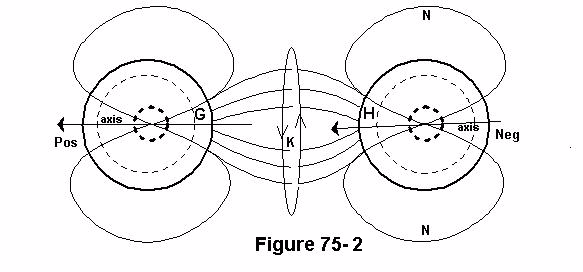 If thus we consider Figure 75-2, where the atoms are facing each other by polarity, and their axis of rotation. If these were in like rotation, I presume that these would at all times keep a good hold of one another.
