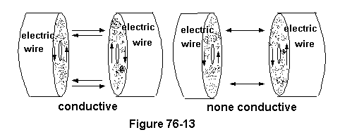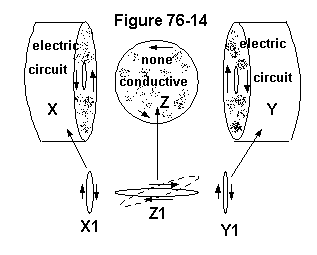 This may in a way be illustrated by Figure 76-14, to have two electrical (or atomic if you will) rotations in like direction of each other, but neither one is able to connect with the other since they are kept separate by a none conductive material. A material in which the movement is neither alike nor unlike those of the electrical potentials.