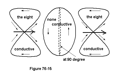 The illustration Figures 76-14, and 76-15, are thus to convey that which we call semi-conductive, with a view to be conductive and none conductive. When by Figure 76-15, we take our none conductive circle of rotation, and turn it by 90 degrees, it would - theoretically - leave an opening for the outgoing (north) movement on the left to join with the ingoing (south) movement of the one on the right.