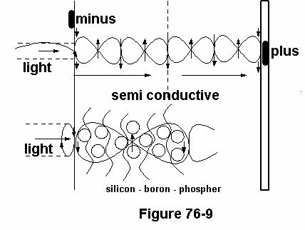 If then I may speculate a little, I drew up an illustration Figure 76-9, the basics of a solar cell, when light falls on this semi conductive material, an electrical potential is raised. But as to how this in every detail takes place, is a tall order.