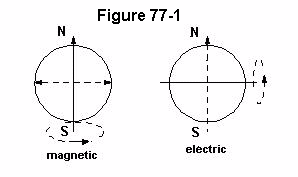 With reference to Figure 77-1, magnetic differs from electric, in that while a magnetic entity normally spins along an axis in alignment with its polarity, electric on the other hand spins by an axis over its equatorial region. Not that there really is an axis with an electrical current, but by figure of speech.