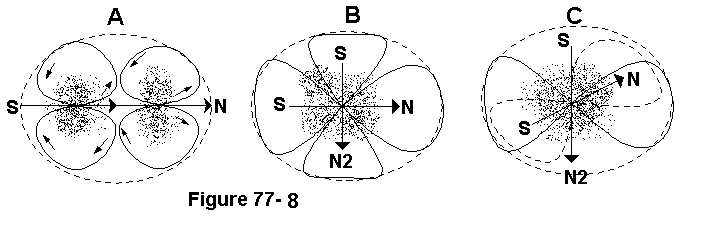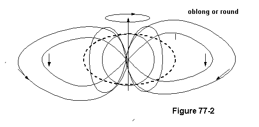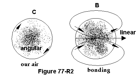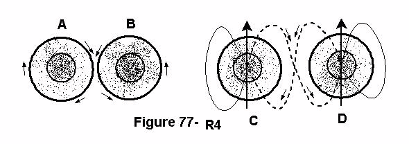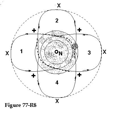 This may be enhanced by Figure 77-R9, looking at it from a side view. The movement from north and around to south also thus inhibits that atom, which as such may be spinning along with the atom. It then may be in the spin of the atom that feeds the patterns of movements, forming them. The atom being one thing, the coordinate another.