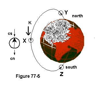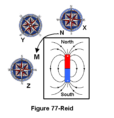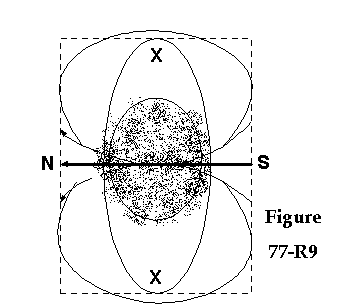 The compass of course as nothing more than a tiny magnet will align itself with like directions of. Wherefore in reference to Figure 77-5, when we are at point X, we are in the middle of those loops that for direction of flow is downward from earth's north to earth's south.