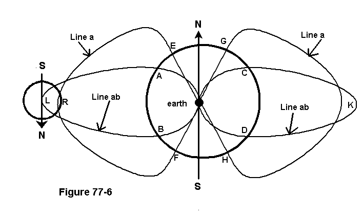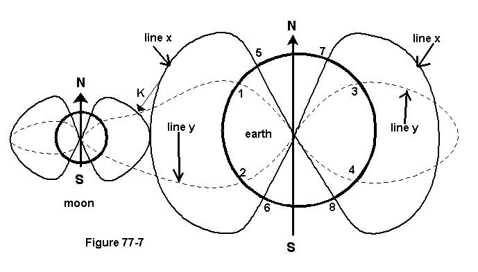 Whereas by Figure 77-7, I have it reversed, to be like unto the polarity of the earth, in which case the earth will no less hold onto the moon, but with the pattern of its magnetic lines in a difference of. Since now the lines in an outgoing flow from both north's are to join themselves at area K.