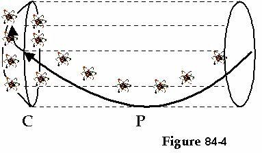 If thus by Figure 84-4 we look at the whole length of such a wave at idle, just as its point is in contact with a potato, all of the rest of the wavelength noted "P" is just passing, it is only the tip at "C" touching our potato. Then in slow motion the rest of that wave moves in tracing its circle upon the potato, boring into it.