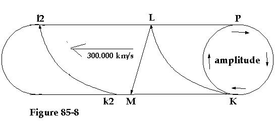 By Figure 85-8 in a three dimensional view the circular amplitude may be seen as a cut-through view of electricity as it rotates, when therefore it turns upon a moving belt it will strike an angle proceeding from K, to L.