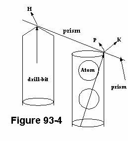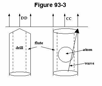 A standard drill-bit on the other hand with its point in the center of its rotation and beveled off would tend to go into direction H. And why then should that same wave in Figure 93-3, with its point at the outer edge of its rotation also pass straight on in toward CC?