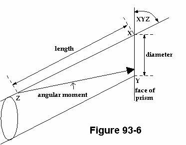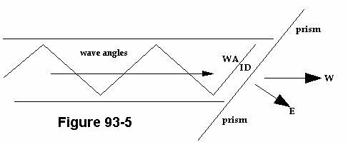 If now we consider a normal sine formation to come upon a prism as per Figure 93-5, the first angle as it strikes upon a prism is parallel with the surface, it should therefore proceed straight on to W. While the trailing angle comes to the XYZ coordinate by which it should refract towards E.