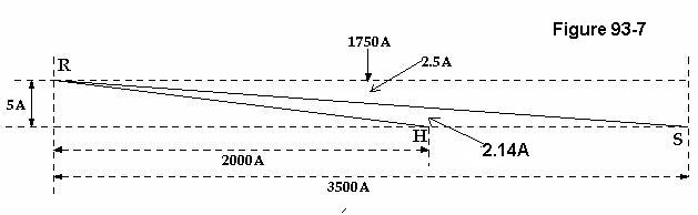 If we substituted millimeters for angstroms, the half length of the blue wave would measure 2-meters with the red at 3.5-meters to a width of 5 millimeters, that per illustration Figure 93-7, comes to a rectangular. As then the red 7000A wave spans from R to S, the blue 4000A wave spans from R to H.