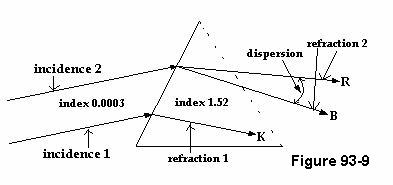 Then with our reference to Figure 93-9, we have only one angle of incidence to one angle of refraction, while I show 2 angles of incidence to more than one angle of refraction. And to debate the current version of it, when light strikes a denser medium such as the prism and is refracted according to the index thereof - there is no separation of the light into its different colors.