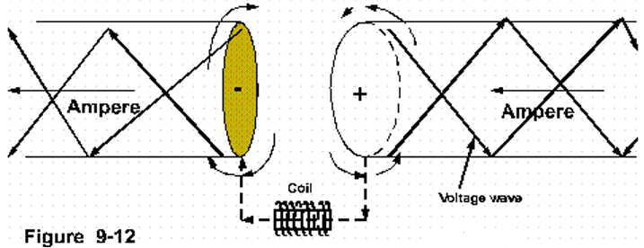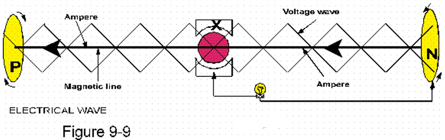 It is therefore that the two angular warlords + and - in figure 9-12 are no longer able to destroy each other when a coil of wire (turns of motion) is connected between them. Here the physical turns of the wire match the turns of the electrical wave.