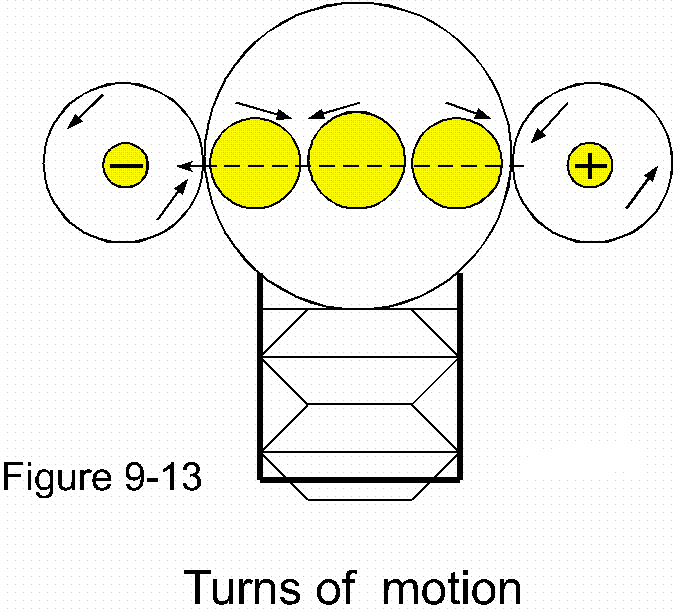 "Turns of motion is the basis on which electrical current is utilized for all its many purposes. Turns of motion as a buffer upon which contrasting movements may be appeased. The tungsten filament of a lamp provides such "turns of motion" illustrated by figure 9-13, as three intermediate wheels connected between ends.