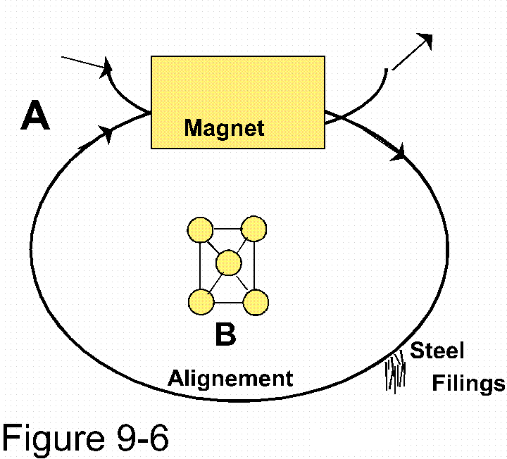 What this means is that magnetic force cannot establish itself nor sustain itself on single atoms, nor even on a series of atoms as presented by figure 9-8-E. It is only able to establish itself upon a structural composition complex enough to lend itself susceptible to entire components.