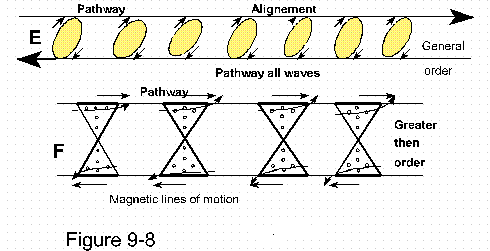 This is further enhanced by figure 9-8-E, the electrons in their orbital movements provide a line of movement for the coordinate of force. Magnetic and electrical waves are thus transposed along the perimeter of the atoms (and molecules and greater) utilizing the angular momentum as the engines to linear force.