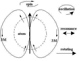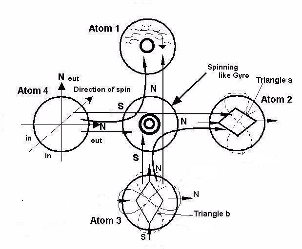 By atom 3 the direction of its internal movement is incoming from the south and outgoing on the right and the top called the north. From here atom 3 with its conductive motion bonds directly to the center atom as well as to the right atom 2, as well as to atom 1, and again to atom 4.