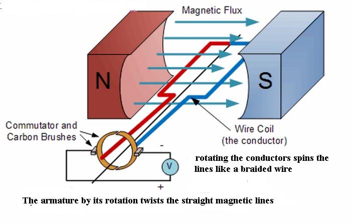 Then comes that angular magnetic force better known as electricity, and for that we look to a standard generator in which there are field coils producing a linear flow across an open area in which an armature is placed that by its rotation comes to twist these normally straight magnetic lines over one another like as one would braid a wire or twist a rubber band.