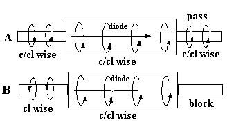 Another example of the rotation in electrical conductivity is found with the diode. By figure 6 at “A” the incoming counter clockwise rotation of the current passes through because the medium within the diode is itself of a counter clockwise rotation.