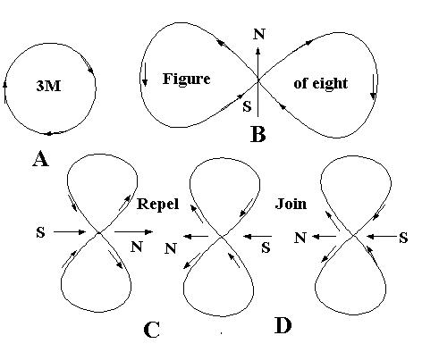 Common magnets display a force to push and to pull straight on; therefore these are called “linear” entities even though their format appears to be two circles to a center, These two circles by experiment are found to be a single circle laid over to resemble the pattern of an eight. The reference here is to figure 2 the lines from X connect through to Z, and A to H.