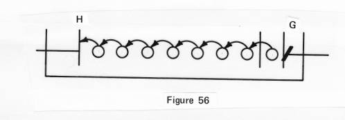 Before we answer this, let us review this point in Figure 56. Suppose our former points in the cathode tube are now represented by points G and H, between which a whole stream of electrons is traveling and each electron must hand over the message of vibrations to the next in line, and let us suppose that they can do this as fast as the speed of light. Shall we then get our message across these points at the speed of light?