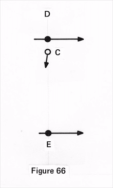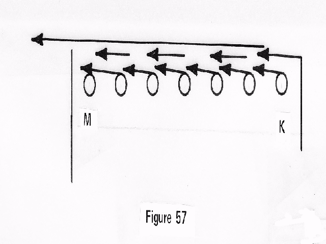 When we take a line of electrons as in Figure 57 and assume them to cast motion into a wave of harmony, like setting up a line of motion, and to cast forth this wave of motion at the speed of light, which is much faster than their own forward motion, we gather that they use a trick of multiplication, something similar to that which we discussed with our radio wave, perhaps, in unity or a combined effort.