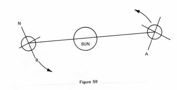 Now this may sound fine and dandy for a spaceship which is not connected to a sun and has no relation of power to hold it in a circle by that sun or to that sun. In such a manner it could move in a circle or in a straight line from A to B. But our earth is very much held to the sun by a very strong rope, lest we be all over in the galaxy, and by this rope we have an indelible relation with the sun as regards our mode of travel and angle of position.
