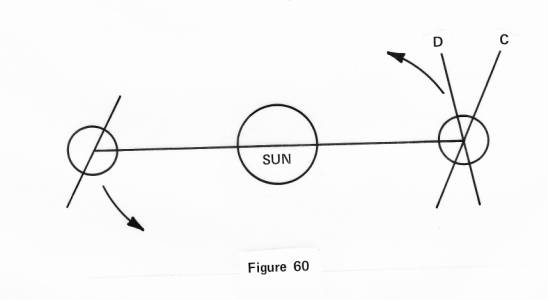 Take a gyro therefore, for our earth is also a gyro, and we place its angle, and pull it around by its center. Then it will remain in that position as demonstrated in Figure 60 except and unless the gyro is processing, for by a precession the earth will tilt its angle as it goes along, and by one turn of precession for each turn of orbit, we have our change of seasons, as may be demonstrated in Figure 60 where point C, at the axis, must change to a position indicated by D, in one-half a circle.