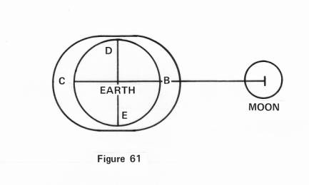 Figure 61 shows the earth marked by five points, the show of the tides, and the moon pulling on the earth. It sound logical that if gravity did indeed pull on earth, that the waters at B, nearest the moon, would be attracted more strongly than anywhere else, causing a high rise of water there, and pulling not so much on the poles, would be less there.