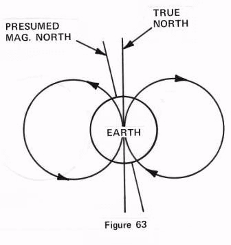 Figure 63 shows the earth and its magnetic force flowing in its figure-eight, and the assumed locality of the magnetic center. But our little compass needle is a magnet also, and it will follow the motion of a magnet no matter where we put it. Therefore it will point on the side of the center of the magnetic force. Realize for yourself how a compass within the earth's lines of force, it will point away from the center, and we can demonstrate it to ourselves with two magnets, a larger one for the earth and a smaller one for the compass.