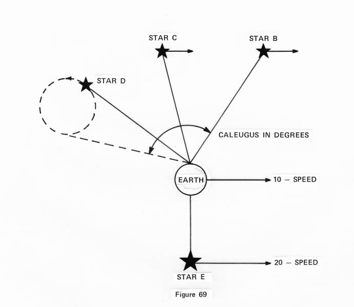 But all such velocities are still compared to D, a point at rest of which we can not be certain. For if it also moves in a linear fashion in addition to the angular motion, then our new velocities calculated are only measures of a difference, and no actualities. Then suppose there is another star E, moving as indicated at a velocity of 20, while we move at 10.